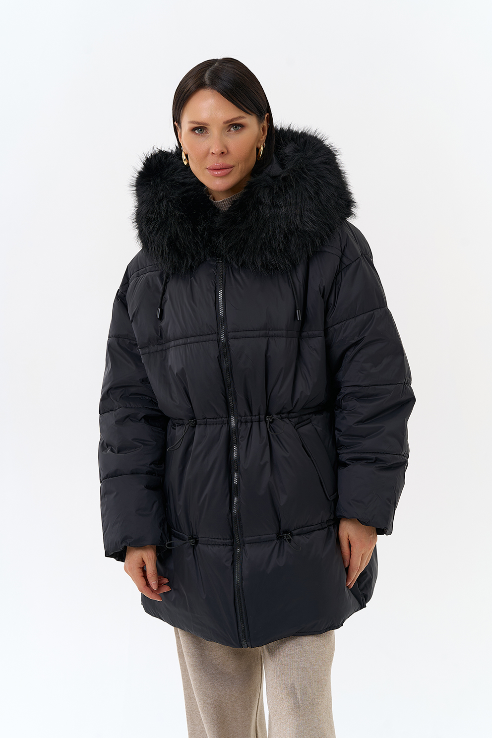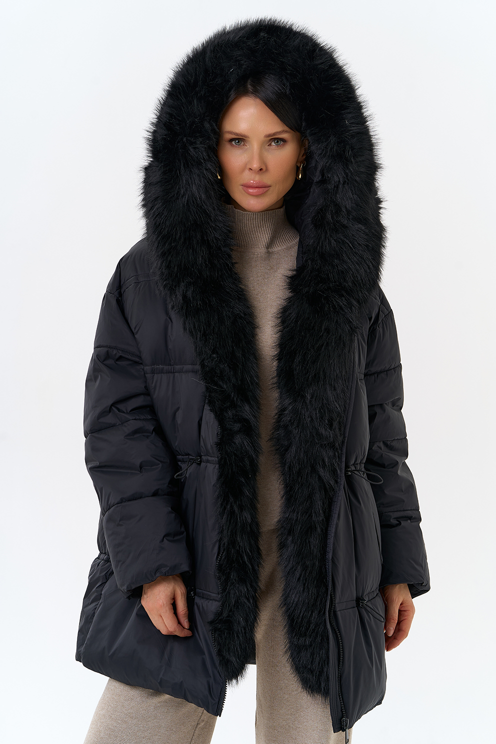 Крой воротника - капюшон, отделка искусственный мех