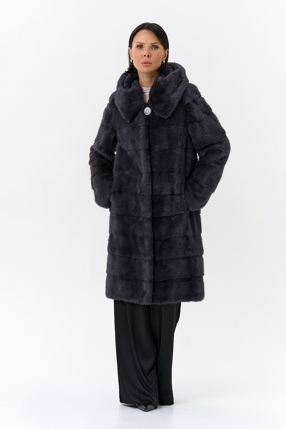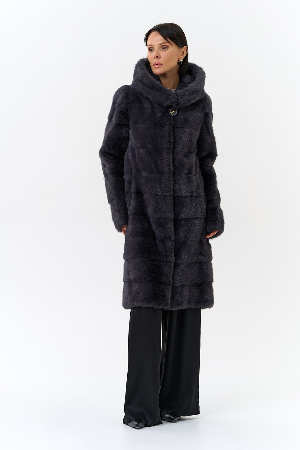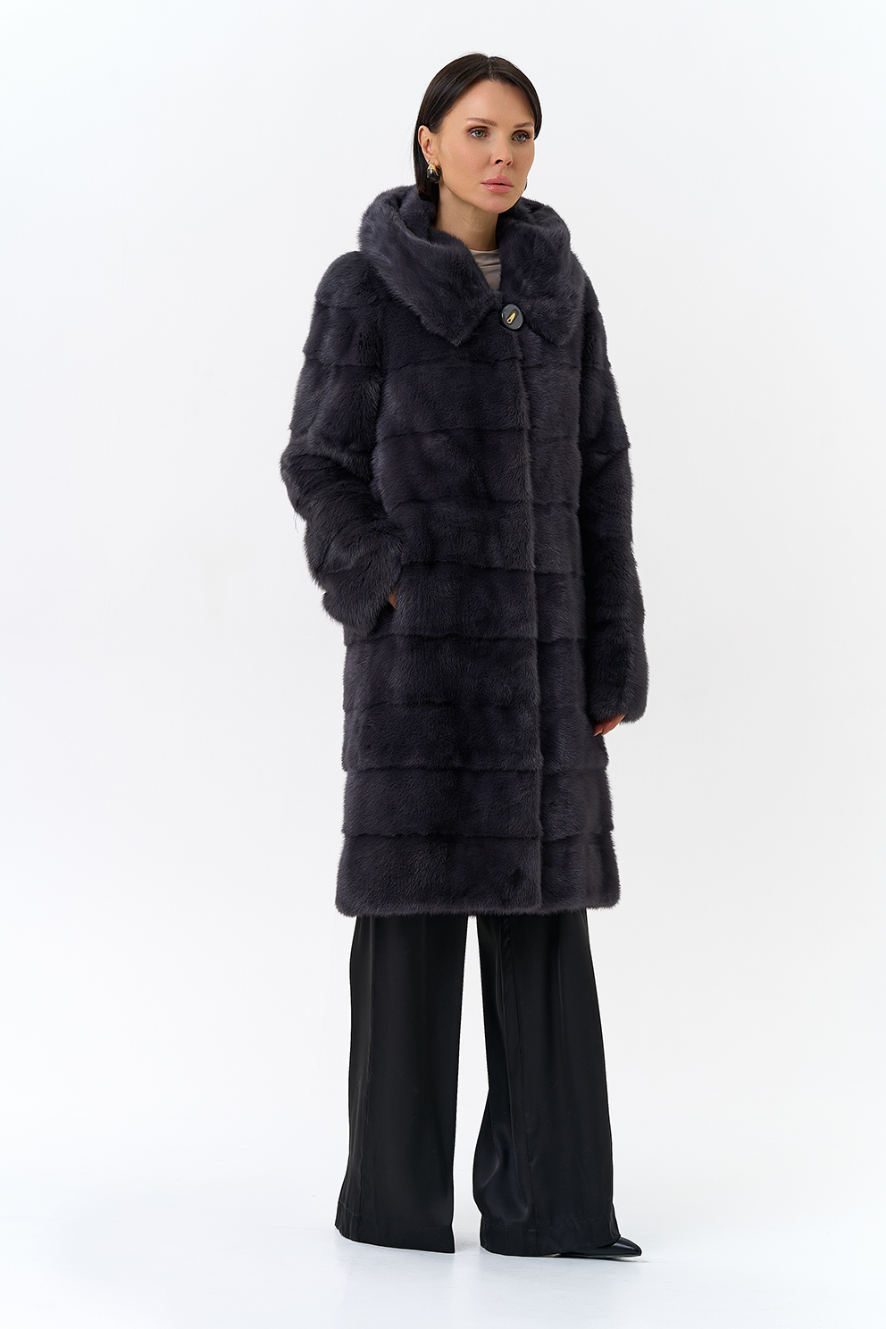 Норковая шуба трансформер в поперечном крое с капюшоном в цвете графит. Каждый день новая модель! Длина изделия трансформируется до 80 см,а рукав до длины ⅞. Шуба дополнена аккуратными пуговицами и крючками.